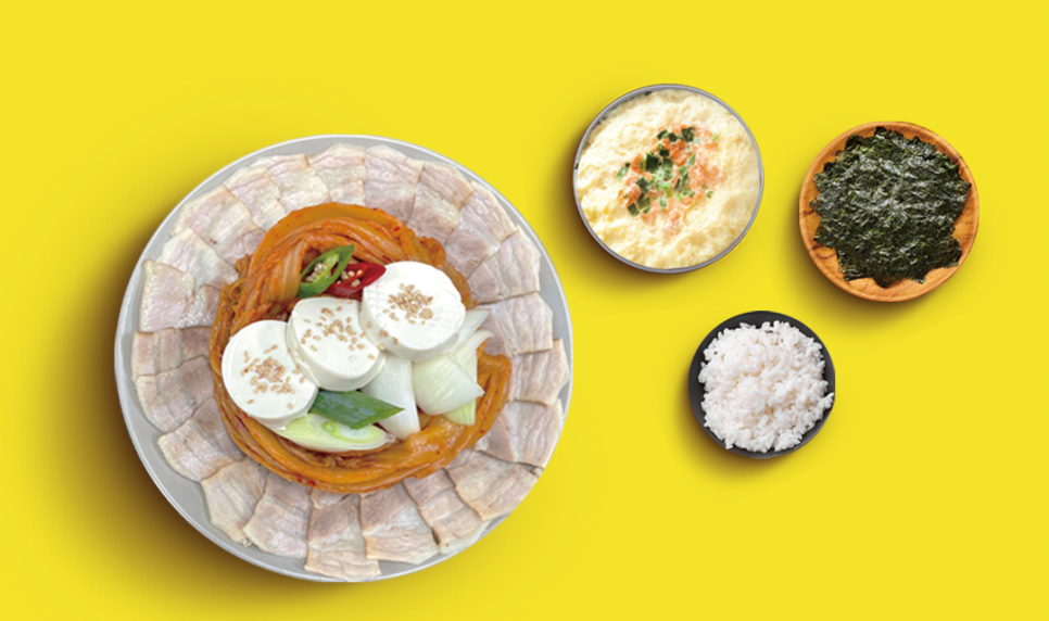 따뜻하게 익은 맛김치에 알맞은 고기(한돈 돼지고기, 차돌 소고기, 삼겹수육)와 어루러지는